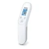 The multifunction thermometer Beurer FT 65 measures the temperature of the ear, the frontal and the ambient temperature of objects and liquids in a few seconds. It does not need contact with the skin since it works by infrared. If the green light appears after the measurement, it means that there is no fever while the red one warns that the person has a body temperature of more than 38ºC.