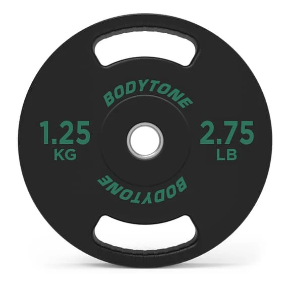 The 1.25 kg rubber disc with grip has a diameter of 28 mm. In addition, it has slotted grips and a central rounded steel ring.