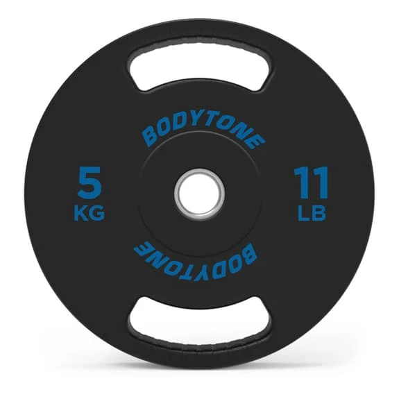 The 1.25 kg rubber disc with grip has a diameter of 28 mm. In addition, it has slotted grips and a central rounded steel ring.
