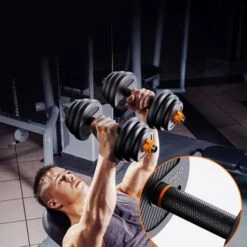 – Includes 4 x 1.5 kg discs, 4 x 2 kg discs, 8 x 2.5 kg discs, 2 dumbbells, 1 padded barbell