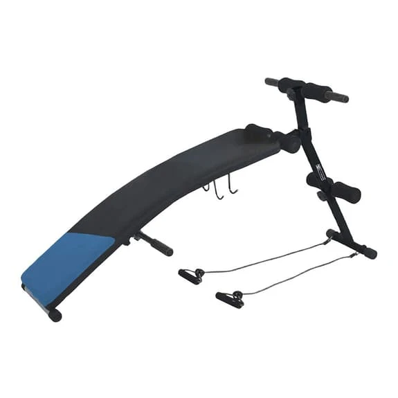 The KRF Fitness abdominal bench can be folded flat for easy storage when not in use.