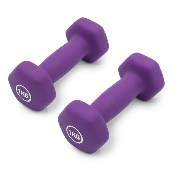 The Leffort 1 kg neoprene dumbbells are made from a single piece of iron and covered with non-slip neoprene in different colours to differentiate the weights.