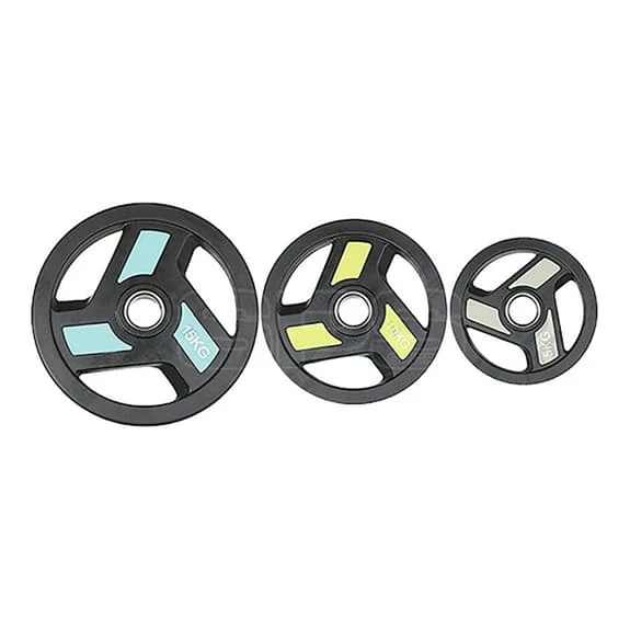 The Softee Modern Olympic disc fits 50 mm diameter bars. It is made with a rubber coating to protect the floor and the gym equipment. Its rubber coating provides a soft and comfortable grip and this dual function gives it versatility when training.