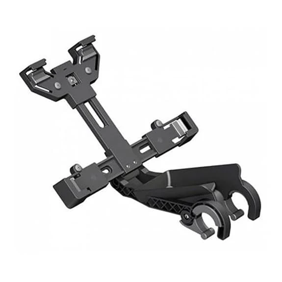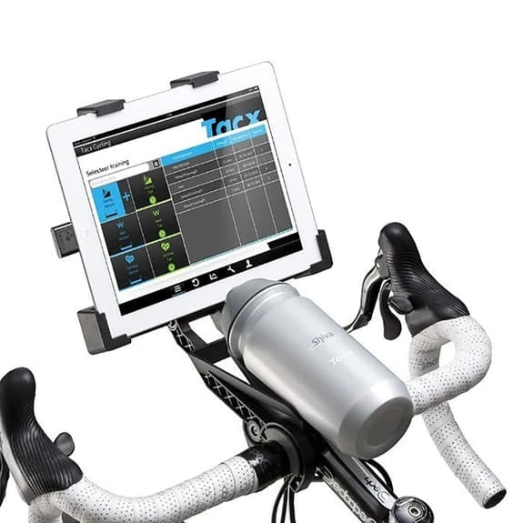Tacx handlebar support that has been developed to hold a tablet on the handlebar of the bicycle. The support fits handlebars between 26 and 35 mm and can be adjusted according to the size of the tablet. It is designed in such a way that sweat is prevented from falling on the screen during training.